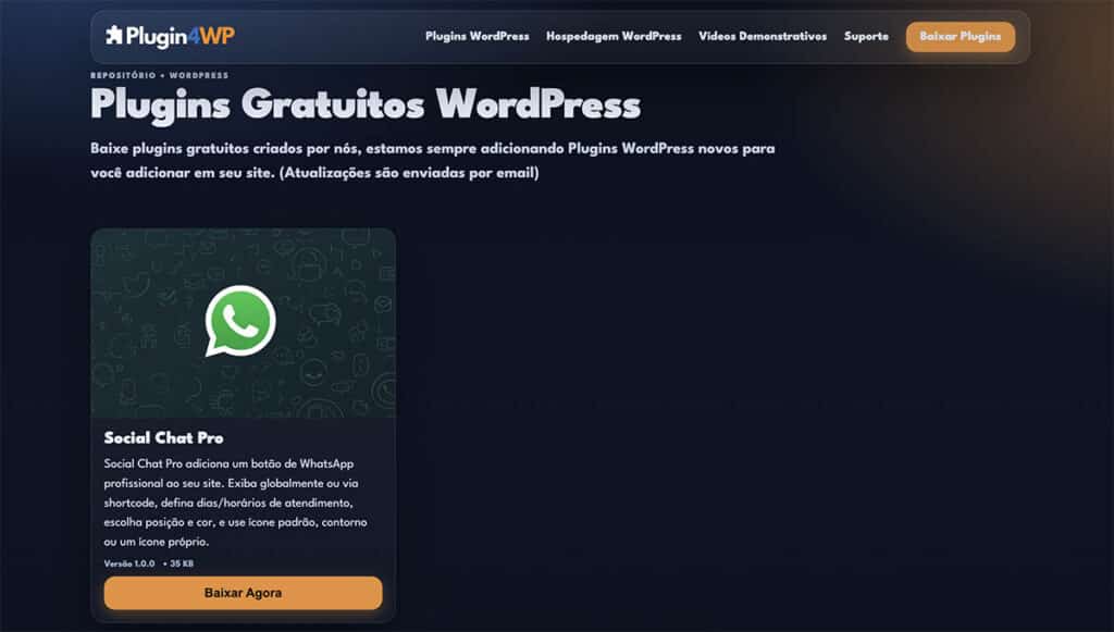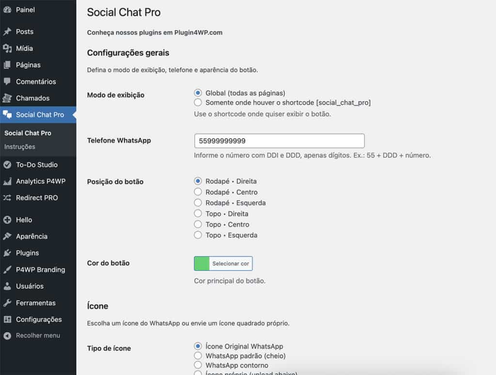 Atualmente de forma gratuita o melhor plugin para botão WhatsApp no WordPress é o Social Chat Pro da Plugin4WP, com ele você além de adicionar o botão do Whats no site, pode também programar horários e dias em que o botão do WhatsApp deve ficar ativo, ou seja, aparecendo no site, pode configurar se o botão de suporte deve aparecer em todas as páginas do site ou em apenas algumas, escolher a cor, ícone, posição do botão WhatsApp, cor.