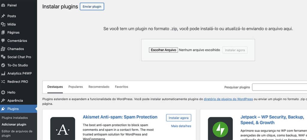 Com o zip do plugin, agora você deve acessar seu wp-admin do seu WordPress, geralmente é SeuDominio.com/wp-admin (altere a parte do domínio), vá em Plugin no menu lateral esquerdo, em seguida clique em ADICIONAR PLUGIN e por último no topo de página clique em ENVIAR PLUGIN. Uma área para envio do zip do plugin irá abrir, como na imagem abaixo: